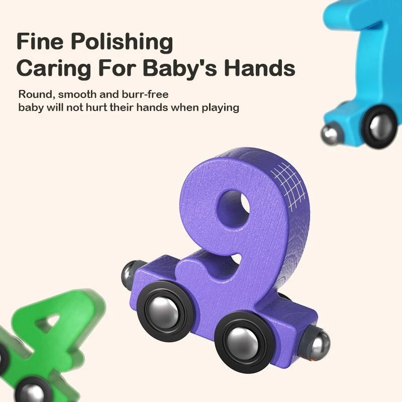 12PCS Number Train: Wooden train set with bright color consists of 11 pcs number and 1 pcs train head, every train body is individual and connected by magnets. Each train has 4 sliding wheels which glide easily.