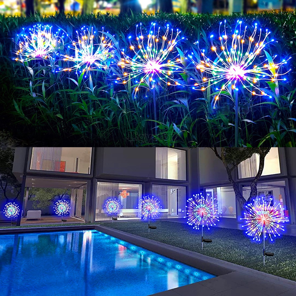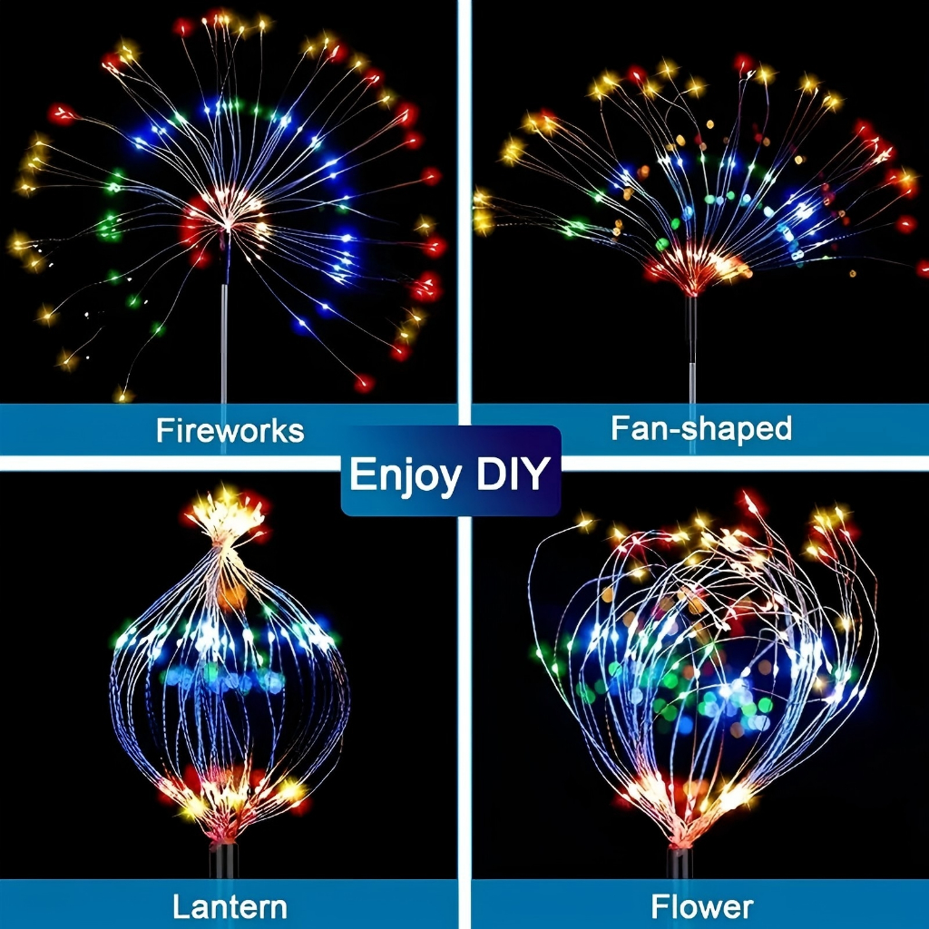 1. Creative Solar Garden Lights This solar firework light with the flexible copper wires , the upgraded high bright small LED beads are distributed on each line, you can twist the flexible copper wires to your favorite shapes such as flowers, fireworks, hearts, spirals, spheres,etc., If you choose multi-color lights, when night falls, these lamp beads light up like colorful fireworks, blooming in the shape of your design, decorate your yard, flower bed